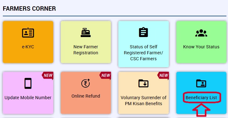 - आपको Farmers Corner में जाकर Beneficiary List पर क्लिक करना होगा जैसा की चित्र में दिखाया गया है|